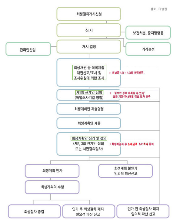 □ 법원의 관리감독실무상 채무자(법인, 개인)이 법원으로부터 보전처분결정을 받은 시점 이후부터는 재산의 처분, 재산의 양수, 계약의 해제 등 중요한 영업상의 행위에 관하여 법원의 허가를 얻도록 하고 있습니다. 법원은 회생절차 개시결정과 동시에 법률상 관리인이 허가 받아야 할 사항을 정하고 있으며, 허가권한의 상당부분을 관리위원에게 위임하여 허가하도록 하고 있습니다. 허가사항에 대하여, 법률상 관리인이 허가를 받지 아니하고 행위한 때에는 그 행위는 무효로 하고, 법률상 관리인은 형사처벌을 받을 수 있습니다. □ 채권자목록의 제출법률상 관리인은 개시결정 당시 법원이 정한 기한 내에 채권자목록을 작성, 제출하여야 합니다. 법률상 관리인이 스스로 명백히 인정하는 채무에 관하여, 채권자명, 채무의 원인 및 금액 등을 기재하여 법원에 제출하는 것입니다. 법률상 관리인이 제출한 목록에 기재되어 있는 채권자는, 신고기간 내에 신고하지 아니하여도 회생계획 인가결정으로 인하여 실권되지 않고, 목록에 기재된 내용에 따라 회생계획안이 정하는 대로의 변제를 받을 수 있게 됩니다. □ 채권조사확정재판법률상 관리인이 시부인표를 통하여 일부 채권자에 대한 채권의 존재를 부정하거나 가액을 부정하였을 경우, 법원은 채권을 부인당한 채권자에게 ‘이의통지서’라는 제목의 우편물을 보내어 그 사실을 알립니다. 또한 채권신고기간 말일부터 1월 이내에 채권조사확정재판을 신청하지 않으면 그대로 확정된다는 안내를 하게 됩니다. 그 기간 내에 재판을 신청하지 않았을 경우에는 법률상 관리인이 부인한 대로 확정되게 됩니다. 채권조사확정재판을 신청하면, 독립적인 하나의 재판이 진행되는 것인데, 법원은 통상의 재판보다 간이절차로 신속하게 진행하여 결정을 내리게 됩니다. □ 조사위원의 조사절차법원은 회생절차 개시결정과 동시에 법원의 간이회생절차 조사위원(공인회계사, 변호사 등)을 조사위원으로 배정하고, 법률상 관리인과 별도로 채무자의 자산 및 부채상황, 영업상황을 조사하여 ‘조사보고서’의 형태로 회생법원에 제출하도록 하고 있습니다. 조사위원은 직접 채무자를 방문하거나 필요한 자료 등을 제출하도록 하여 채무자의 자산과 부채현황을 조사한 후, 직전 수년간의 영업현황을 바탕으로 향후 10년간 채무자가 어느 정도의 변제재원을 확보할 수 있는지를 계산하는 한편, 채무자가 현재 시점에서 파산하게 되면 채권자들에게 얼마나 변제가 이루어질 수 있는지를 산정하게 됩니다. 법원은 통상 조사위원의 조사보고서를 토대로, 청산가치보다 계속기업가치가 높은 경우에만 이후 절차를 계속 진행하고, 그 반대의 경우는 회생절차를 중단하는 결정을 내리게 됩니다. □ 제1회 관계인집회법률상 관리인이 회생절차에 이르게 된 사정 등을 채권자들에게 설명하고, 조사위원이 조사한 부채 및 자산 현황 등을 보고하도록 한 후, 회생절차를 계속 진행하는 것이 적정한지에 대한 의견을 듣는 집회입니다. 채권자 등 이해관계인은 의견을 진술할 기회를 부여받게 됩니다. 법원은 채무법인의 계속기업가치가 청산가치보다 크다고 인정되면, 법률상 관리인에게 사업을 계속하는 내용의 회생계획안을 제출할 것을 명하게 됩니다. 통상 법원은 법률상 관리인으로 하여금 관리인보고서(시부인표 포함), 출석현황표, 예상질문 및 답변사항을 미리 작성하여 제출하게 하고, 조사보고서를 포함한 자료일체를 제1회 관계인집회 당일 이해관계인들에게 배부하도록 지도하고 있습니다. 단, 개정된 ‘채무자 회생법’에서는 ‘필요한 경우 개최할 수 있다’고 하여 실제적으로 약 3개월 정도의 기간을 단축할 수 있게 되었습니다. □ 회생계획안의 작성 및 제출조사위원이 산정하여 보고한 내용을 기초로, 법률상 관리인은 향후 채무자가 각 채권자별, 연도별로 어떻게 변제할 것인지의 계획안을 작성하여 채권자들의 결의에 부치게 됩니다. 법률상 관리인이 제출한 회생계획안이 회생담보권자 의결권의 3/4 초과의 동의와 회생채권자 채권총액 의결권의 2/3 초과의 동의 또는 회생채권총액 의결권의 1/2 초과와 회생채권자 수의 과반수의 동의를 얻게 되면, 법원은 법적인 하자가 없는 한 회생계획안 인가결정을 하게 되는데, 인가결정 후에는 회생계획안의 내용대로만 변제하면 됩니다. 그러므로 회생계획안은 인가 후 채무자의 채무상환 매뉴얼이므로 채무자의 회생에 부담이 되지 않으면서도 채권자들의 동의를 얻어낼 수 있는 합리적인 내용으로 작성되어야 합니다. 또한 채권자들은 변제받는 채무금액과 변제의 시기에 민감하고, 금융기관마다 회생계획안의 동의여부에 관한 다른 기준들을 갖고 있기 때문에 채무자는 금융기관별 동의기준을 사전에 미리 인식하고 회생계획안을 작성합니다. □ 제2,3회 관계인집회법률상 관리인이 제출한 회생계획안을 심리하고, 채권자들의 동의를 묻는 결의를 하기 위한 집회입니다. 법원은 법률상 관리인으로 하여금 관리인보고서, 출석현황표, 예상질문 및 답변사항을 미리 작성하여 제출하게 하고, 제2,3회 관계인집회 당일 