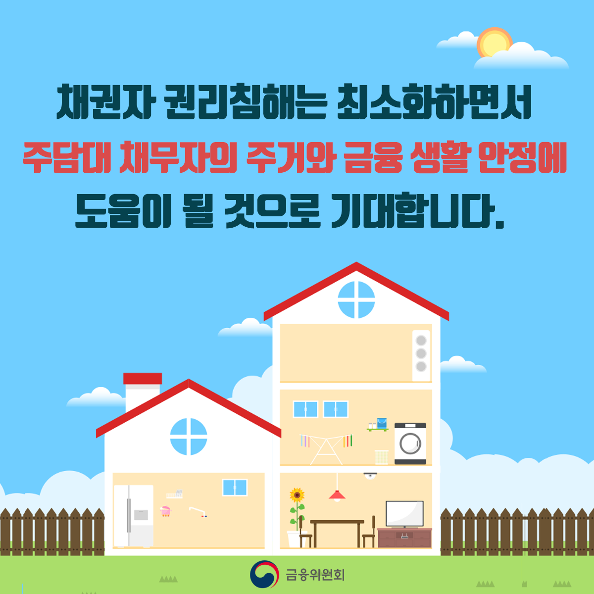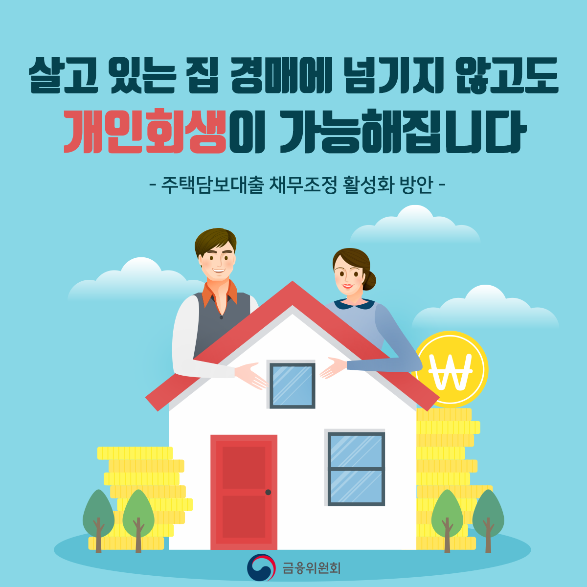 살고 있는 집 경매에 넘기지 않고도 개인회생이 가능해집니다 ” 채권자 권리침해는 최소화하면서 주담대 채무자의 주거와 금융 생활 안정에 도움이 될 것으로 기대합니다. <자료출처: 금융위원회>