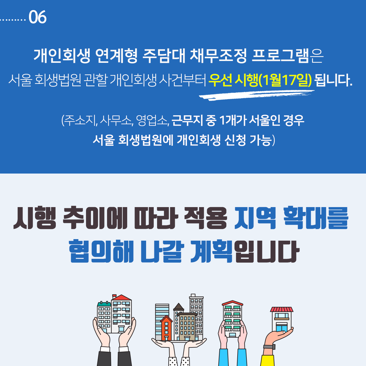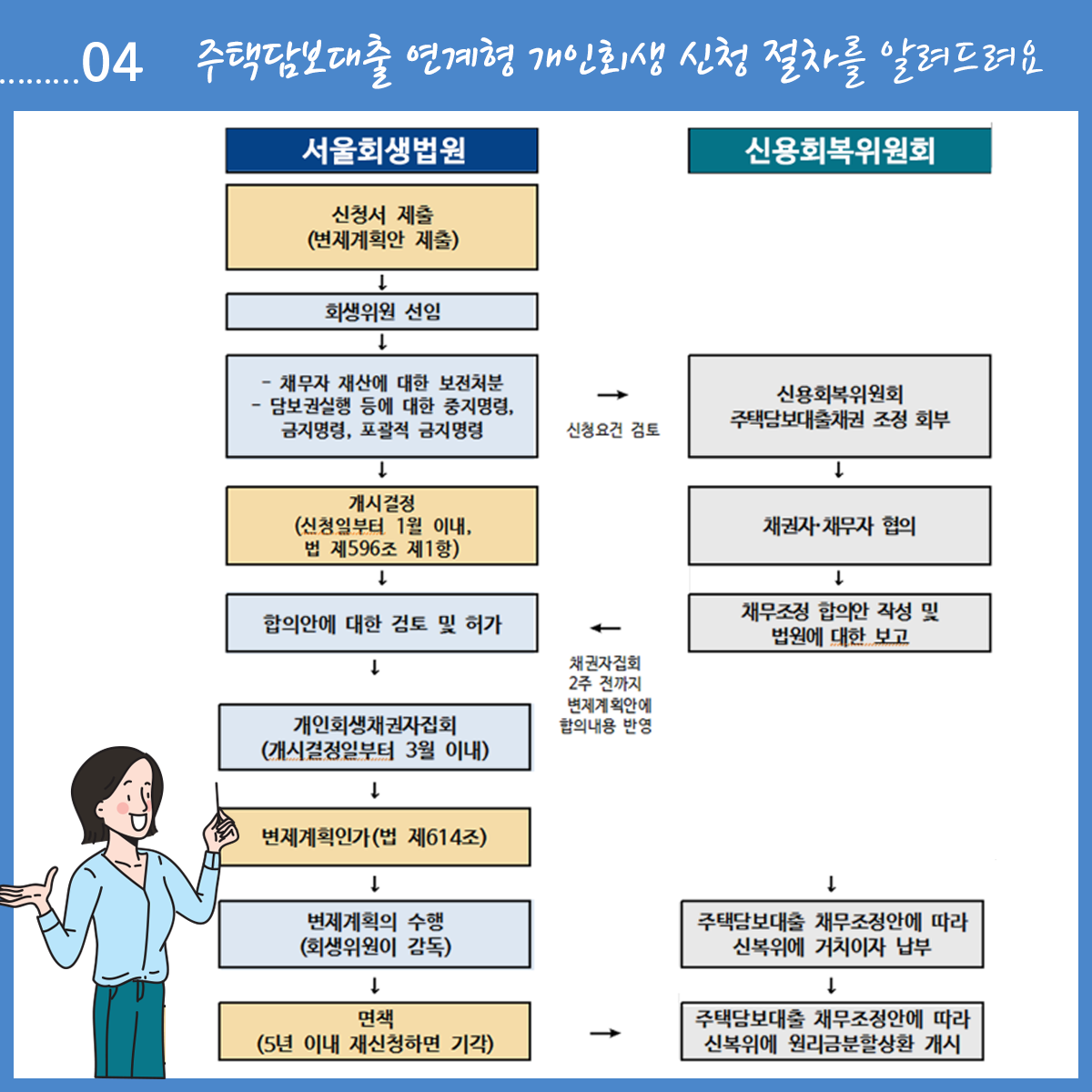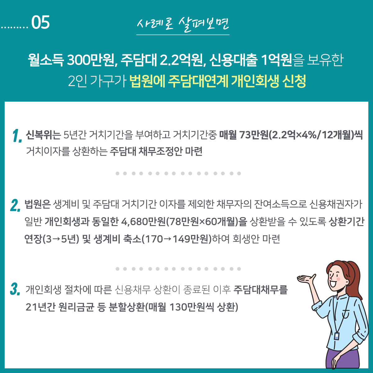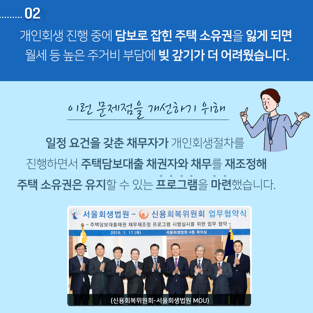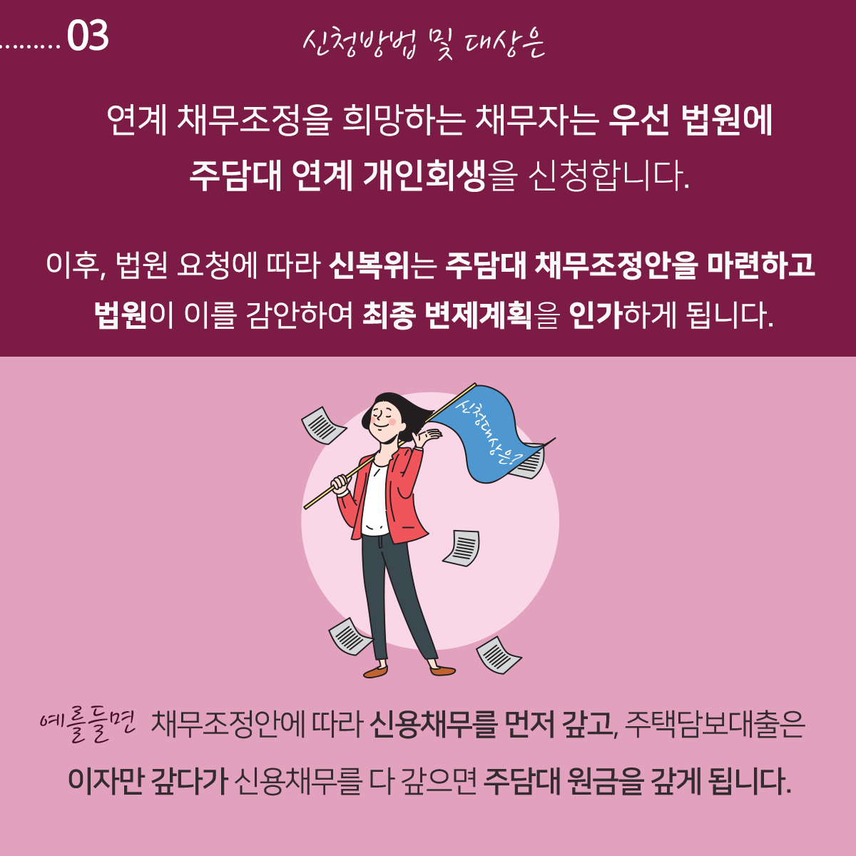 살고 있는 집 경매에 넘기지 않고도 개인회생이 가능해집니다 이런 문제점을 개선하기 위해 일정 요건을 갖춘 채무자가 개인회생절차를 진행하면서 주택담보대출 채권자와 채무를 재조정해 주택 소유권을 유지 할 수 있는 프로그램을 마련했습니다. 신청방법 및 대상은 연계 채무조정을 희망하는 채무자는 우선 법원에 주담대 연계 개안회생을 신청합니다. 이후, 법원 요청에 따라 신복위는 주담대 채무조정안을 마련하고 법원이 이를 감안하여 최종 변제계획을 인가하게 됩니다. 사례로 살펴보면, 월소득 300만원, 주담대 2.2억원, 신용대출 1억원을 보유한 2인 가구가 법원에 주담대연계 개인회생 신청 개인회생 연계형 주담대 채무조정 프로그램은 서울회생법원 관할 개인회생 사건부터 우선 시행(1월 17일)됩니다. 시행 추이에 따라 적용 지역 확대를 협의해 나갈 계획입니다. 채권자 권리침해는 최소화하면서 주담대 채무자의 주거와 금융 생활 안정에 도움이 될 것으로 기대합니다.